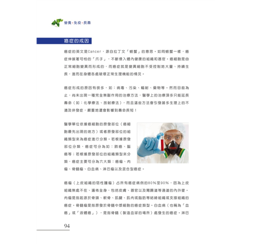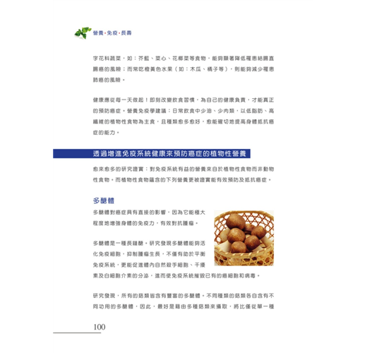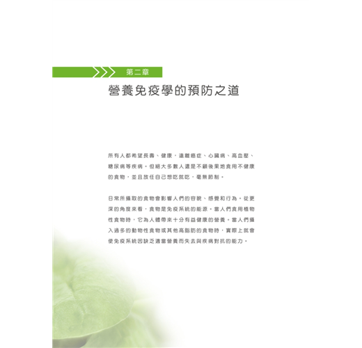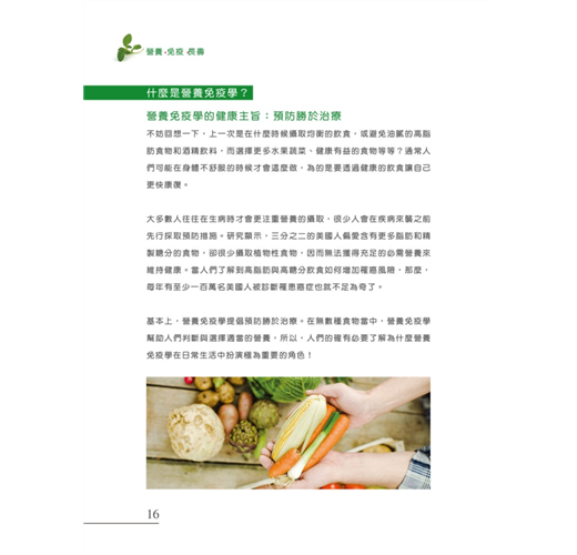 但並非所有的天然植物都能安全或健康地作為日常攝取的植物性食物,如菸草、古柯葉、罌粟等。而現代人最煩惱、困擾的癌症、肥胖、心血管疾病、過敏、自體免疫性疾病、骨骼關節問題、骨質疏鬆症、皮膚、視力、睡眠、更年期......等等問題,都能透過營養免疫學來調整改善,關於這些部分,在本書中都有詳盡的介紹。
