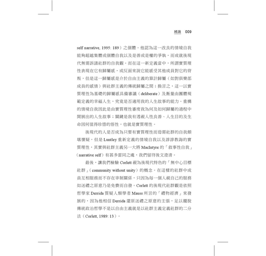 後現代的人是否成為只要有實質理性而毋需社群的自我頗堪懷疑,但是Luntley 重新定義的情境自我以及諄諄教誨的實質理性,其實與社群主義另一大將MacIntyre 的「敘事性自我」(narrative self)有甚多雷同之處,我們留待後文澄清。