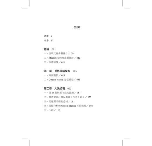 在Brydon 與Coleman 為加拿大卑詩大學的全球化系列叢書合編的《重新議價社群》中,他們開宗明義把編完全書的心得寫成上述引言。句中的「仍然」顯示編者認為像社群(community)這麼古老的人群集合,在全球化或者有人慣稱後現代的今天,依舊承擔使人互信、互賴並為集體目標而共同行動的功能。本書的重要主旨之一幾乎可以用同一引言表述,不同的是我們不讓從社群到信任再到集體合作的因果關係停留在「心得」的層次。我們要用一個脫胎理性選擇論(rational choice)的互信模型,論證社群的面對面溝通特徵如何透過形成內部的互惠規範與成員的名聲,影響到社群成員的行動與合作結果;並用三章的篇幅,以可代表從傳統、現代、到後現代典型的三種台灣人社群,去檢驗由互信模型導出的命題孰偽孰真。