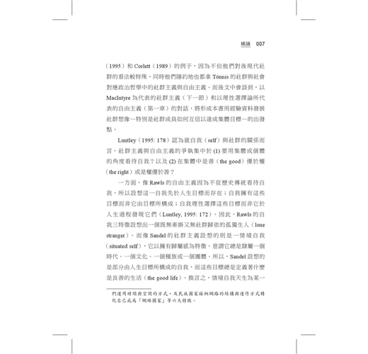 另一方面,有更多的學者投身發展直線型的後現代社會關係理論。社會學者中提倡風險社會的Beck,以及主張網絡社會的Castells 已是耳熟能詳。讓我們轉而舉出兩位哲學家Luntley(1995)和Corlett(1989)的例子,因為不但他們對後現代社群的看法較特殊,同時他們隱約地也都拿Tönnis 的社群與社會對應政治哲學中的社群主義與自由主義。而後文中會談到,以MacIntyre 為代表的社群主義(下一節)和以理性選擇論所代表的自由主義(第一章)的對話,將形成本書用經驗資料發展社群想像—特別是社群成員如何互信以達成集體目標—的出發