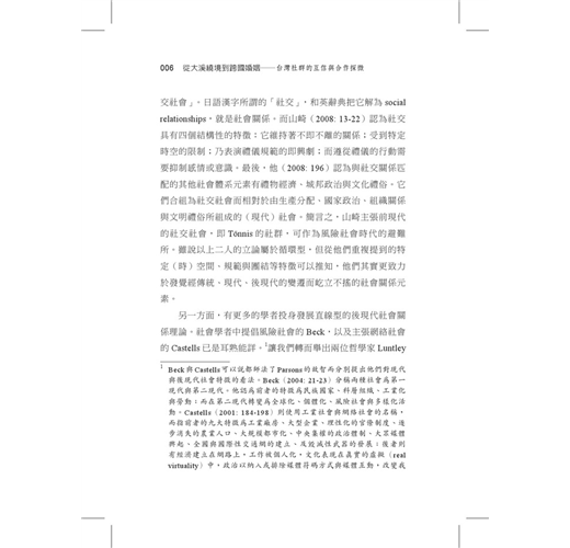 其次,因為體會到大部分的後學理論者,除了Foucault 之外,幾乎都不曾動手動腳找資料,他們難免受到為理論而理論或視理論為美學創作之譏。所以在本書中,我回到把對三個社群的觀察視為檢驗所謂互信模型的14 個假設的證據之老路,姑稱為是回到「新」實證主義的路徑。以質性證據檢驗假設如何能稱為是「新」實證?我的理由奠基於 Luntley( 1995)這位不太出名的哲學家的一本小書。書中認為後現代理論至少提醒我們,實證主義教我們唾棄日常語言轉而相信數學語言描繪的宇宙真理,只因為後一語言的意義是自足的;它不容許在運算中得出不同的歧義。這樣的實證主義Luntley 認為是無法用來理解人文社會的,試想人際的受想行識或悲歡離合有多少是出自日常語言造成的「誤會」?進而言之,Darwin 的演化論與Smith 的國富論不都是用當時洗練的英語寫的,看看他們所創始的學門在20 世紀所造成的波瀾!既然本書是用許多的小故事來驗證理論,參酌Luntley 之說我只得說奉行的是新實證主義。