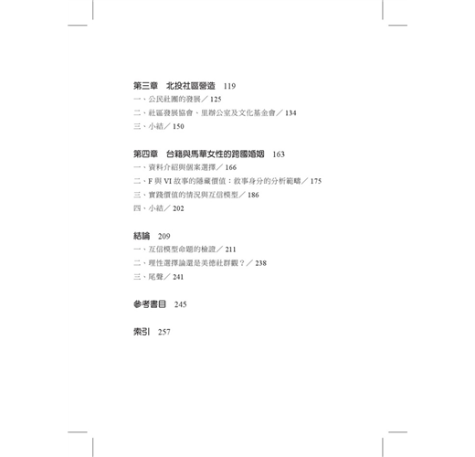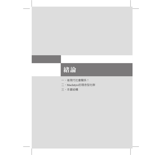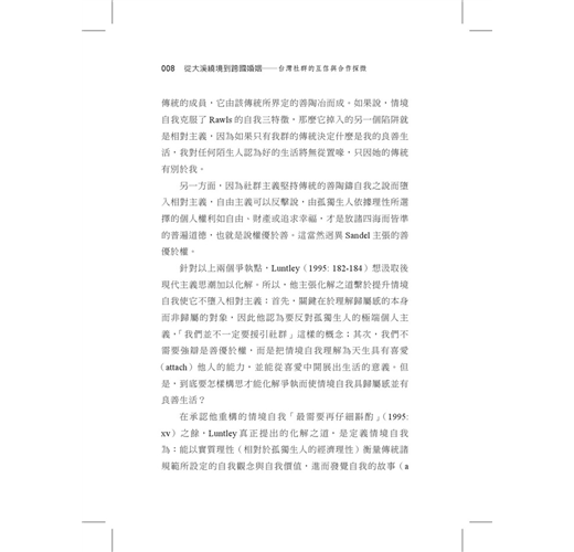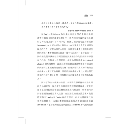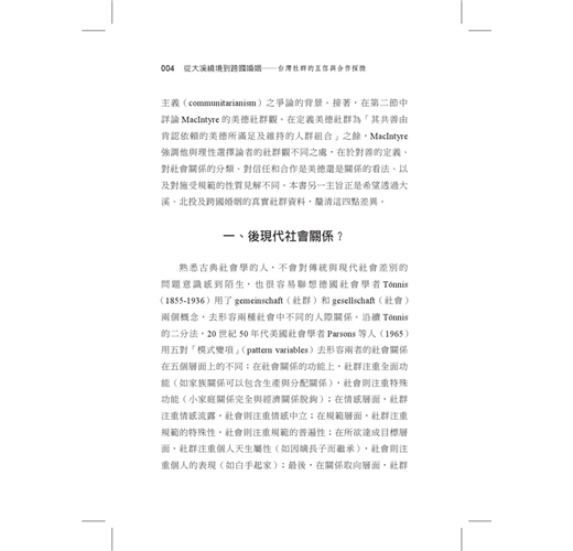 而為了帶出本書另一主旨,本章將從學界歷來有分人群組合為傳統型、現代型及後現代型等問題意識說起,著重在當下正逢現代型社會關係轉型為後現代型之際,學者如何分以循環型與直線型方式立論。在討論直線型立論之處,我們特別舉出Luntley 和Corlett 兩位哲學家,如何建構後現代自我與社群觀念,以導出本書的理論框架乃攸關由自由主義(liberalism)推衍出的理性選擇論與由MacIntyre 所代表的社群主義(communitarianism)之爭論的背景。接著,在第二節中詳論MacIntyre 的美德社群觀。在定義美德社群為「其共善由肯認依賴的美德所滿足及維持的人群組合」之餘,MacIntyre強調他與理性選擇論者的社群觀不同之處,在於對善的定義、對社會關係的分類、對信任和合作是美德還是關係的看法、以及對施受規範的性質見解不同。本書另一主旨正是希望透過大溪、北投及跨國婚姻的真實社群資料,釐清這四點差異。