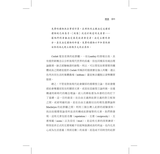 總之,不管是對後現代社會關係的循環型立論,思欲發覺經社會變遷而恆在的關係元素,或是如直線型立論所做,在建構適用新時代的概念理論,前人的耕耘都為本書的目的打下了基礎。這一目的就是:在自由主義與社群主義的對立框架之間,或更明確的說,是在自由主義推衍出的理性選擇論與MacIntyre 的社群觀之間,利用三個台灣人社群的經驗資料,找出如循環型論者所追求的構成社群凝聚的元素。我們將發現,這些元素包括名聲(reputation)、互惠(reciprocity)、互惠規範(norm)以及信任(trust);是這些元素的因果鍊索,特別是非正式的互惠規範不但能夠協調成員的利益,也內化其心成為生活意義(得到名聲)的泉源,而造成不同時空的社群卻都能集體合作,完成目標。