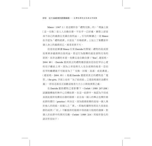 最後,讓我們檢驗Corlett 視為後現代特色的「無中心目標社群」(community without unity)的概念。在這樣的社群中成員互相服務而不存在宰制關係,只因為每一個人視自己的服務如送禮之原意乃是免費而自發。Corlett 的後現代社群觀是依照哲學家Derrida 質疑人類學者Mauss 所言的「禮物經濟」來發展的,因為他相信Derrida 還原送禮之原意的主張,足以擺脫傳統政治哲學不是以自由主義就是以社群主義定義社群的二分法(Corlett, 1989: 13)。