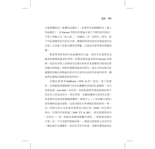 法國社會學者Maffesoli(1996: 21-27)認為,當下從鄰里、友朋網絡到網路聊天室各色團體所表現的社會關係,可以用新部落(neo-tribe)來形容。而新部落與早期基督教社群不但在本土的成員身分、特定空間、及團結機制方面若符合節,更重要的是兩者都顯露集體對一神聖中心(上帝或魅力領袖)的仰賴與妥協的過程。這是回頭從分析傳統社群取經的一例。另一例則可從日本社會思想學者山崎正和(2008)的近著中看出。在著作的結尾處(2008: 271 & 289),他先感慨現在的「全球化……是一個使社會關係解體的過程」,接著提出解決方案:在「不可克服的風險社會……應當以能夠與之並存的另一種社會作為避難所,毋須多言即可知道,這樣的環境就是社交社會」。日語漢字所謂的「社交」,和英辭典把它解為social relationships,就是社會關係。而山崎(2008: 13-22)認為社交具有四個結構性的特徵:它維持著不即不離的關係;受到特定時空的限制;乃表演禮儀規範的即興劇;而遵從禮儀的行動需要抑制感情或意識。最後,他(2008: 196)認為與社交關係匹配的其他社會體系元素有禮物經濟、城邦政治與文化禮俗。它們合組為社交社會而相對於由生產分配、國家政治、組織關係與文明禮俗所組成的(現代)社會。簡言之,山崎主張前現代的社交社會,即Tönnis 的社群,可作為風險社會時代的避難所。雖說以上二人的立論屬於循環型,但從他們重複提到的特定(時)空間、規範與團結等特徵可以推知,他們其實更致力於發覺經傳統、現代、後現代的變遷而屹立不搖的社會關係元素。