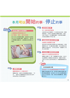.各月份「本月可以開始的事‧停止的事」「何時可以帶寶寶外出散步?」「可以開始使用吸鼻器了嗎?」「培養寶寶早睡早起習慣的最好時機是什麼時候?」「寶寶可以換穿兩件式衣服了嗎?」……在對的時機,用最適當的方式照顧寶寶,寶寶開心,爸媽也輕鬆!