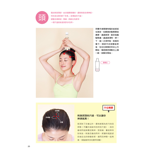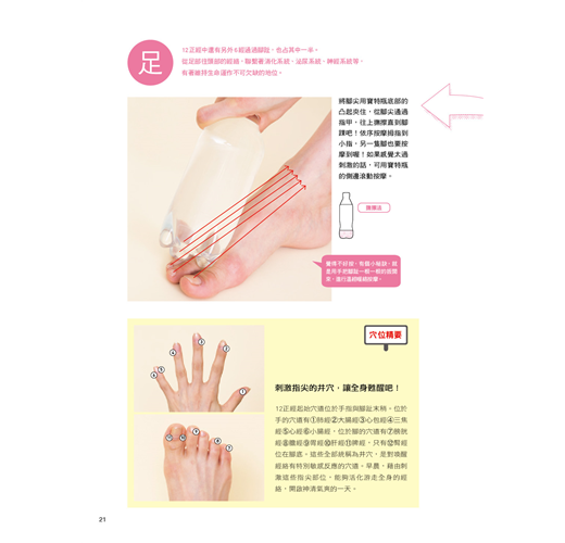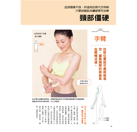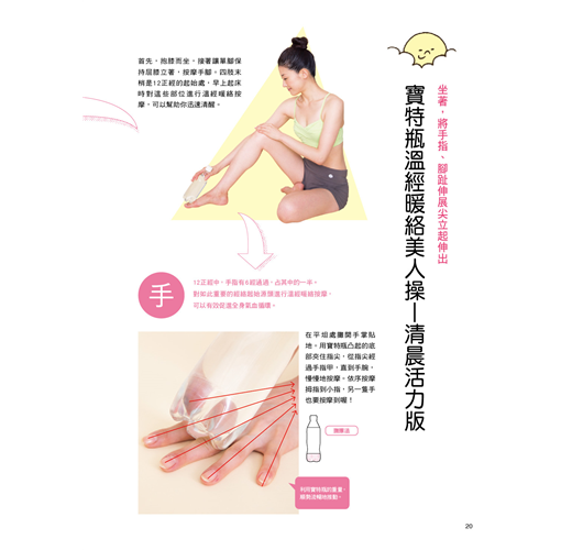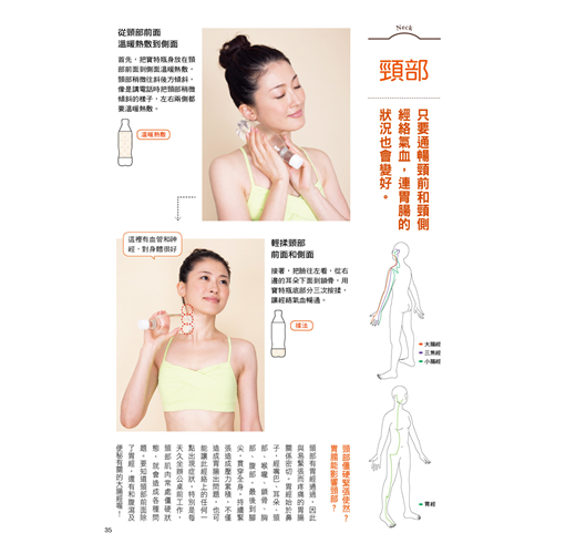.圖解清晰,所有動作一目瞭然 – 針對每個問題的按摩動作都有對應療癒的經絡示意圖,讓你清楚瞭解問題所關連的經絡。內容中所有運用寶特瓶進行的溫經暖絡按摩,都有大小適中的清晰照片,並有動作方向及順序的標示,讓你隨時隨地都能很容易跟著本書一起學習最正確的動作,達到所需要的效果。
