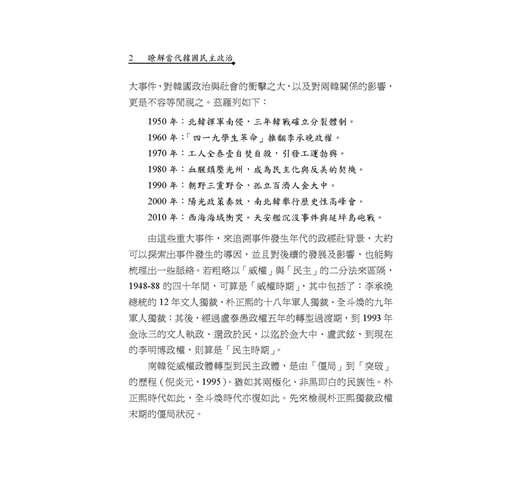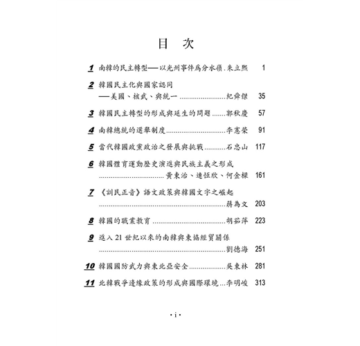 本書收錄了十一篇論文,從政治、社會、文化乃至於體育活動等層面,探究韓國現民主政治發展的歷程。透過這十一篇論文,可以使讀者更深入瞭解到韓國在現代民主政治進程中,於各個層面的發展脈絡,以及其國民在民主政治的體制中,對於民族與國家的強烈認同感。