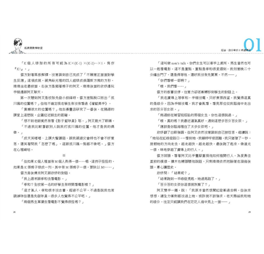 「不可思議!一開始看就停不下來,直到最後一頁,而且竟然是一本談數學的書。雖然早就知道作者非常善於將數學結合生活,以輕鬆有趣的方式傳達,但寫出一本--而非一篇--結合校園生活,刻畫特色人物,並且讓我這個數學庸才衝動得想提筆寫算式的輕小說?這是怎麼回事?」──鄭國威(PanSci泛科學總編輯)