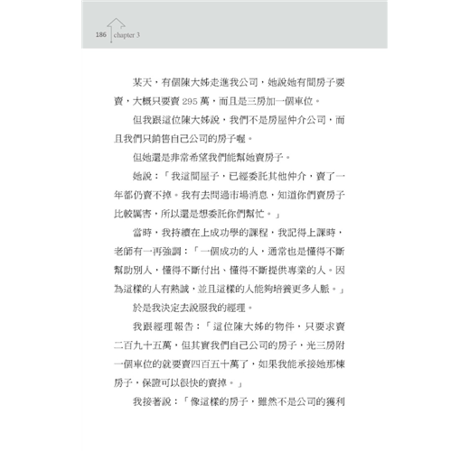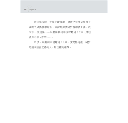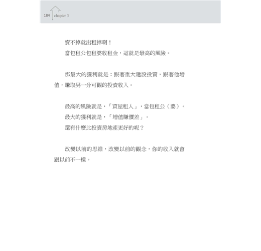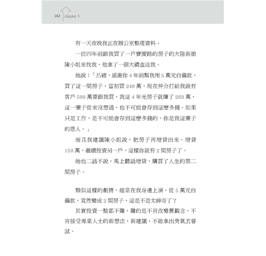 一般投資客,很少能夠像我這般快速的累積成交物件,最主要原因,如同第四章說過的,是因為忘了自己買屋的立場,是投資理財,而非自住。投資買房只要