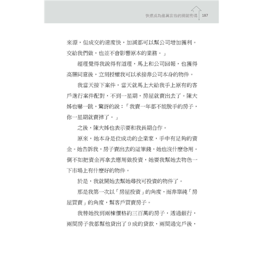 而幾乎在我進入這行的同一個月,我就知曉,投資房屋比單純買賣房屋要能夠獲得更大利潤。我的標準作業模式,在此也不吝和大家分享。