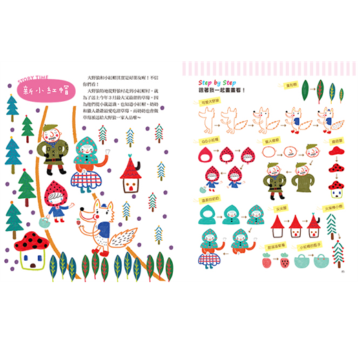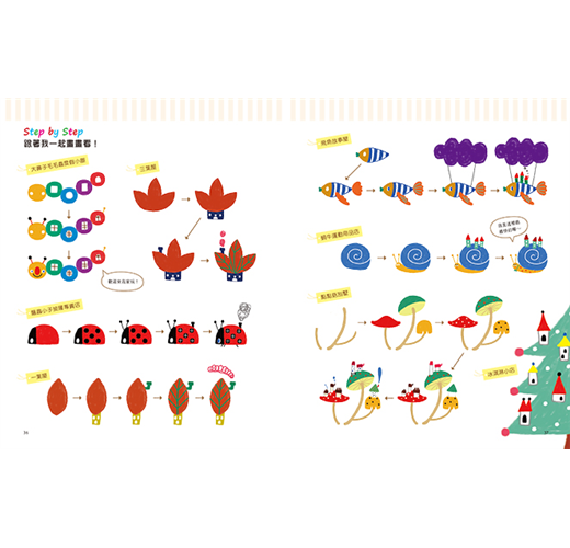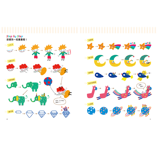 接下來再透過書中的指示、步驟、塗色、勞作等多方引導去培養小朋友多方面的美學力:1.敢開口的「說故事能力」。2.不受阻擾的「想像力」。3.敢動筆的「畫畫力」。4.敢下手的「創意力」。