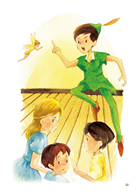 溫蒂和兩個弟弟撒上金粉,跟著小飛俠,經過無數日夜,終於降落在小孩的樂園~夢幻島!