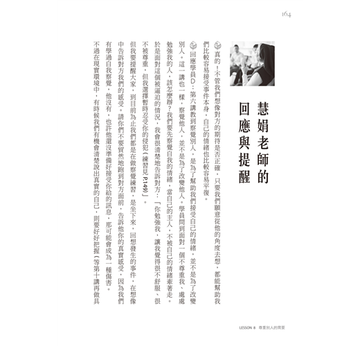 前面第一階段叫做「學會照顧自己的需要」,下個階段就是「照顧別人的需要」,用前面所學的察覺方法,來同理他人、諒解他人、給予他人空間,進而讓「我」和「我以外的人」形成一個和諧的、包容的、互愛的關係。黃慧娟老師貢獻她豐富的帶領人經驗,設計好多心靈練習題,供大家自行練習,在市面上是非常難得一見的創舉。