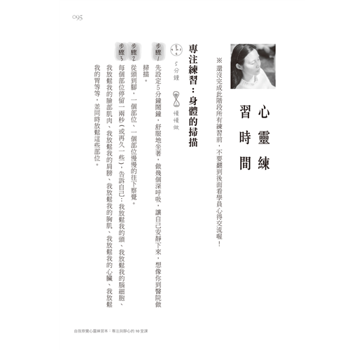 ‧每天找個固定時間做練習,一次用一個感官做練習就好。時間允許的話,做完一個練習後休息一下,沉澱一下再做下一個。也可以利用零星時間,不拘時間長短,隨時隨地做練習。