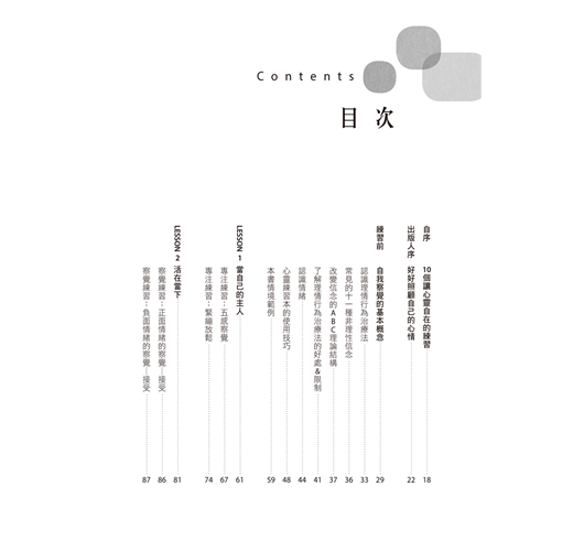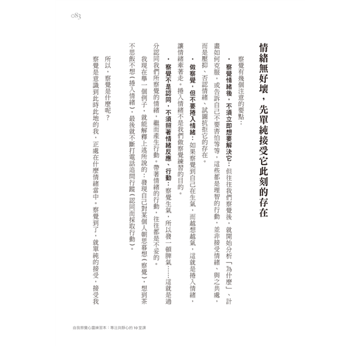 再沒有比走不出低落或不平心情,卻仍要繼續做著日常工作,承擔好幾個角色的責任,更令人窒息和苦悶的。黃慧娟老師在台北耕莘文教院曾帶領過10年的「自我察覺」工作坊,經熟年優雅學院邀請,以DIY手冊形式,帶領讀者可以跟著10堂課,依序從「靜心」、「專注」、「察覺情緒」、「接受情緒」、「陪伴情緒」最後是「放下情緒」。