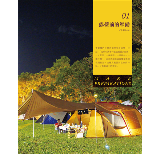 由多位露營達人傳授主題式露營的規劃,並配合節慶來佈置帳篷,讓露營成為最令人期待和心動的小旅行。