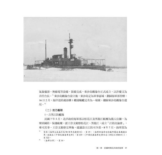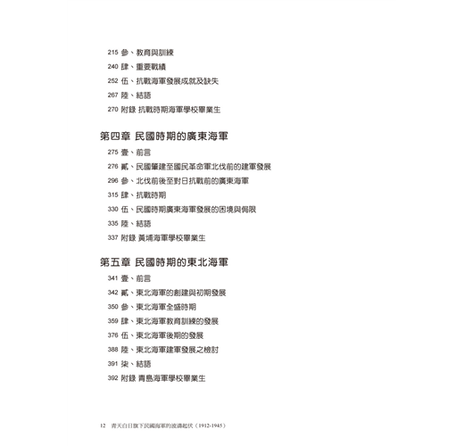 從大學部到碩、博士班,個人在國立成功大學歷史系、所悠遊十餘載歲月,感謝母校成大師長的教誨與栽培。而本書的完成,特別感謝鄭梓教授,如果沒有他的督促、啟發與鼓勵,不會有本書的出版問世。也感謝深諳近代海軍發展史的海軍耆宿徐學海中將,近年來對筆者的訓勉與提點。另部分史料承蒙學棣國防部史政處史政員孫建中先生、前海軍軍史館館長沈天羽先生惠予支援、借閱,銘感在心!謝謝成大博物館前任館長褚晴暉教授的協助與指導,其結合科學與人文的學術風範值得景仰;而沈天羽先生除負責協助排版美編外,最後定稿亦多次參與討論、校正,同時也提供本書絕大部分其個人珍藏非常珍貴的史料照片,其中許多是兩岸相關海軍史書籍首度正式面世,使本書增色不少,特此致上最深的謝忱!當然本書未盡之處必在所難免,疏漏亦多,尚祈各界方家、先進與讀者不吝指正。