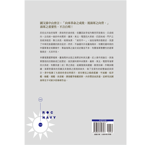 本書蒐整國軍檔案、臺海兩岸出版之海軍史料與文獻、近人著作與論文、與海軍耆宿的回憶錄或口述歷史,就民國時期中央閩系、廣東、東北、電雷等海軍四大系統,有關其建(成)軍之源起,組織發展與遞嬗、教育訓練、作戰與戰績、海軍對國家的頁獻及其發展之困境與缺失,做了全面性的綜整論述與探討。書中收錄了大量的珍貴史料照片,更有稀見之船政藍圖、平面圖、巡洋艦、砲艦、運艦、魚雷艇、測量艦等船艦留影,內容豐富而詳盡,是研究民國海軍史不可缺少的參研作品。