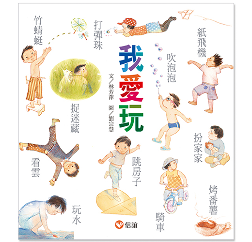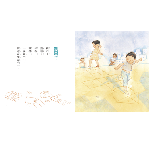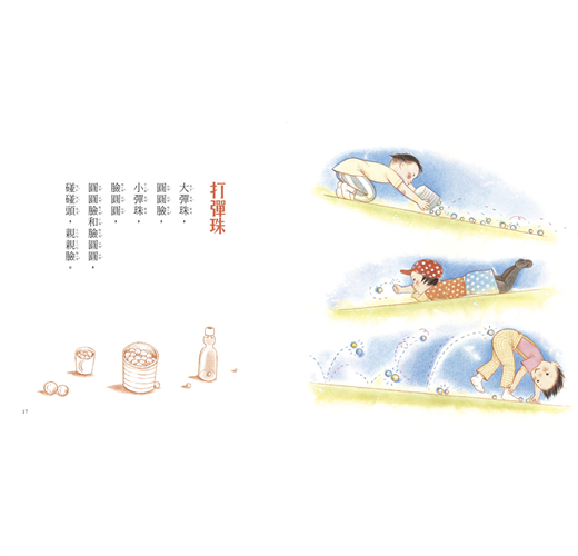 信誼幼兒文學獎作家林芳萍,以懷舊的童年遊戲為題,創作出20首韻律感、動感十足的兒歌。無論是跳房子、打彈珠、紙飛機、竹蜻蜓……還有鄉下的烤地瓜等等,每首兒歌用字簡潔,好讀又好記,字裡行間充滿了遊戲的記憶,和童年的無憂無慮。