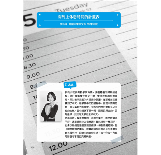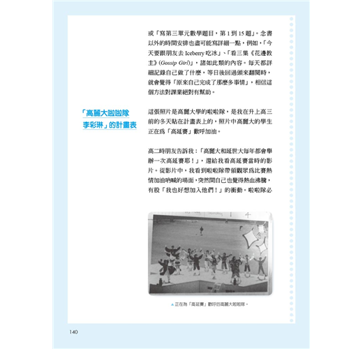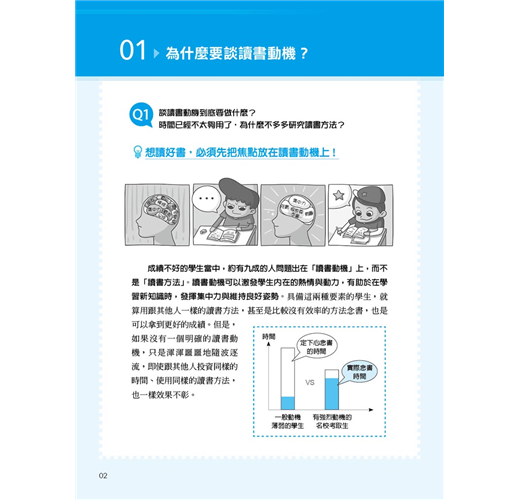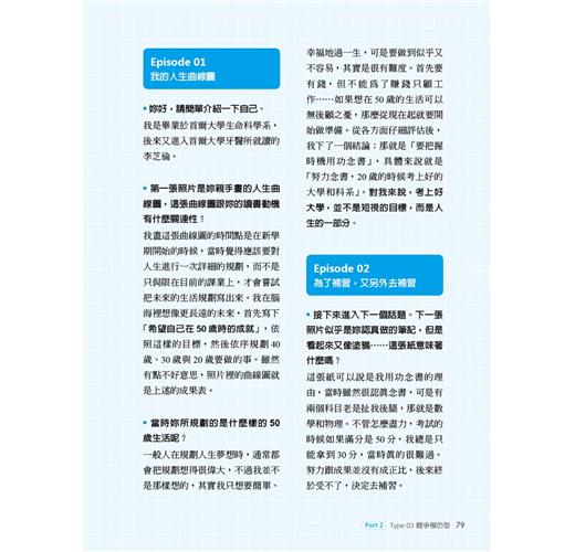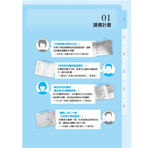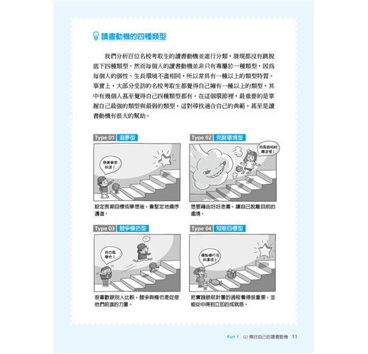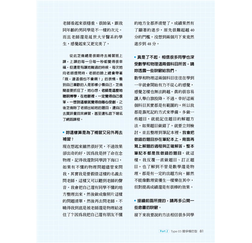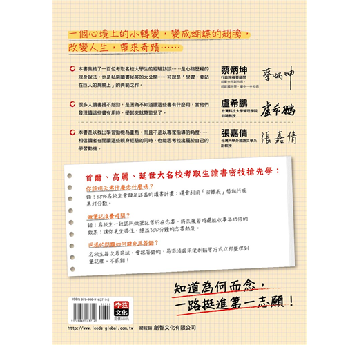 世俗的眼光、別人的讀書理由、父母的期望等雖然也算是讀書動機,但若是不適合自己,無法打從心底認同,還是無法成為原動力。心理學家班杜拉(Albert Bandura)曾說:「參考別人的最佳典範,正是學習的第一階段。」從本書無數熱血的翻轉故事中,極可能會遇見令你怦然心動的讀書動機,你可以從中挑選出最符合自身狀況的類型,當成仿效的典範,或者藉以觸發出自己的獨家版本。當然,這些實戰經驗豐富的名校生也分享了許多珍貴的第一手讀書撇步⋯⋯