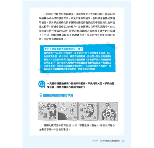 學習動機與學習方法同是學習成效的關鍵。市面上不難找到介紹學習方法的書籍,但對大多數學生來說,若無強烈的學習動機,讀書策略如筆記、時間管理等,往往淪為紙上談兵。本書是以找出學習動機為重點,而且不是以專家指導的角度,而是訪談了百位韓國名校生,看這些學生是如何根據自己的個性與環境,找出適合自己的學習動機與學習方法。