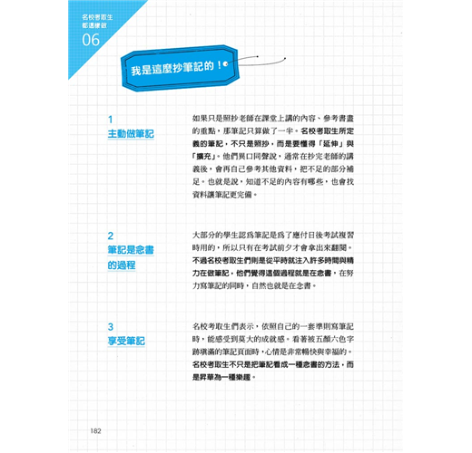 .做筆記浪費時間?錯!百位名校生一致認同做筆記等同念書,而且擁有絕佳複習效果,還能練出精準判斷哪些才是出題重點的「選球眼」。做筆記還有一個副作用:讓你更坐得住,練出300分鐘的念書熱度。