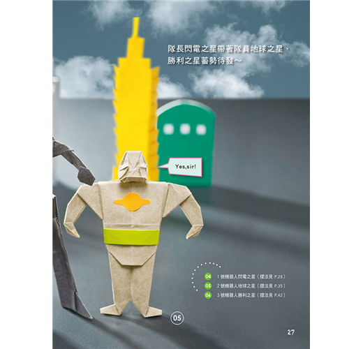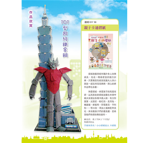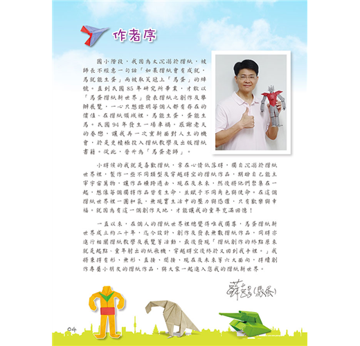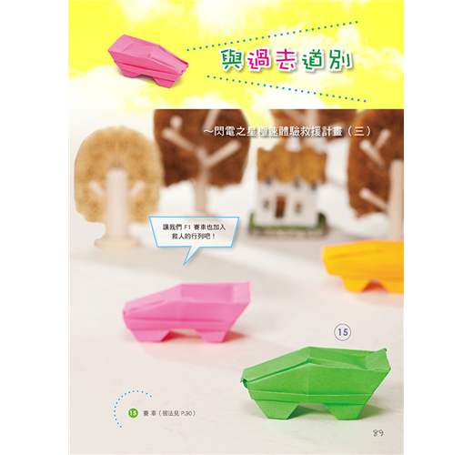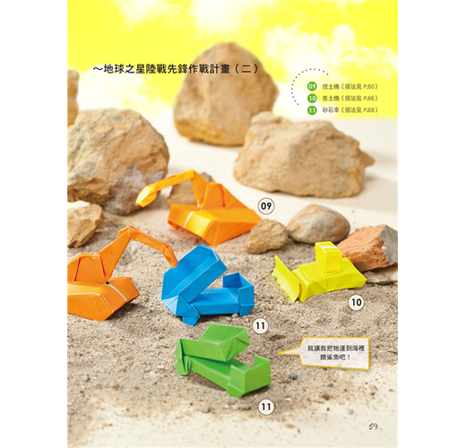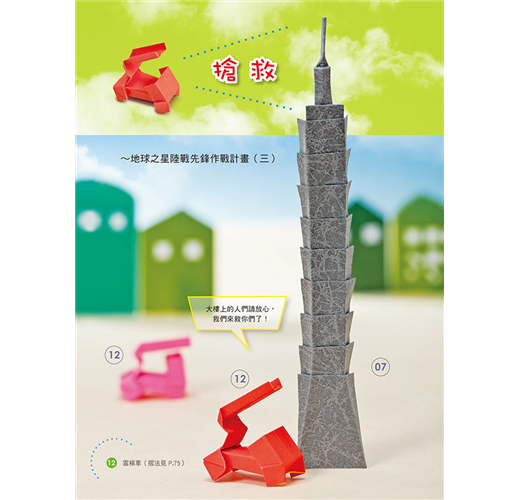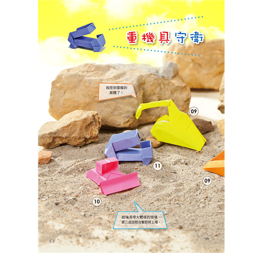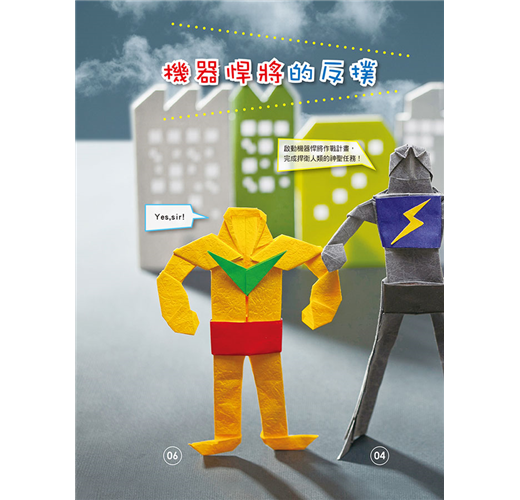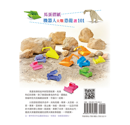 馬蛋老師的這本新型摺紙書,充滿科幻與想像。除了教摺如書名的作品,還藉此穿越時空大玩編劇說故事,手腦口一起動。22款原創摺紙作品中,上有高鐵、戰車、太空梭、火箭、賽車、雲梯車、挖土機、快艇、潛水艇.....以及早期的卡通科學小飛俠~鳳凰號,串聯了未來、現在與古代,邀請大家邊摺紙邊玩星際大戰故事遊戲,一同歡樂。