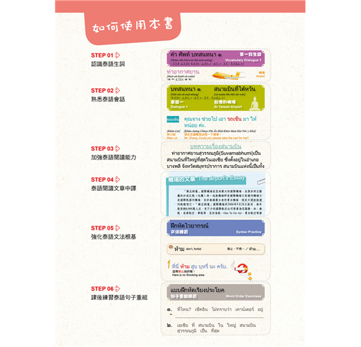從認識泰語生詞→熟悉泰語會話→加強泰文閱讀能力→強化泰語文法根基→練習泰文句子重組,藉由這五大學習步驟,記憶力及理解力大提升,一輩子都忘不掉。