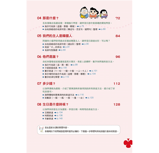 從害羞詢問喜歡的人的生日中,學習到月、日、星期、時間…等的說法,也透過句型練習詢問某事件的發生時間,並瞭解在日本要詢問年齡時所需遵守的禮節。
