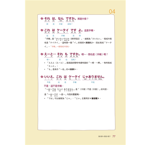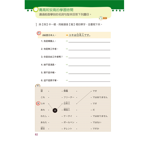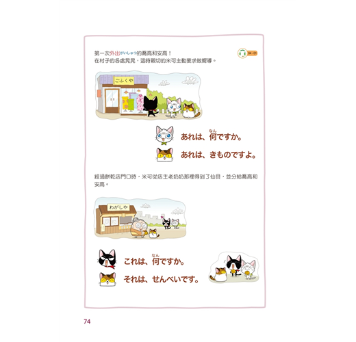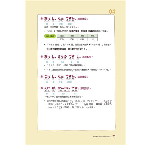 從認識日本特產-仙貝與和服中,學習到指示代名詞以及基本陳述句、否定句、疑問句,並透過句型練習,擴展職業、物品等單字。