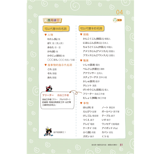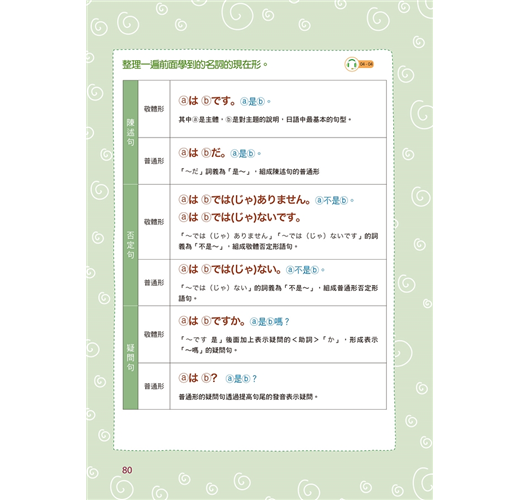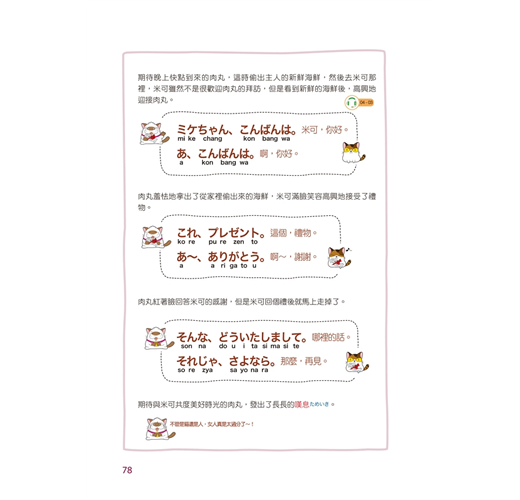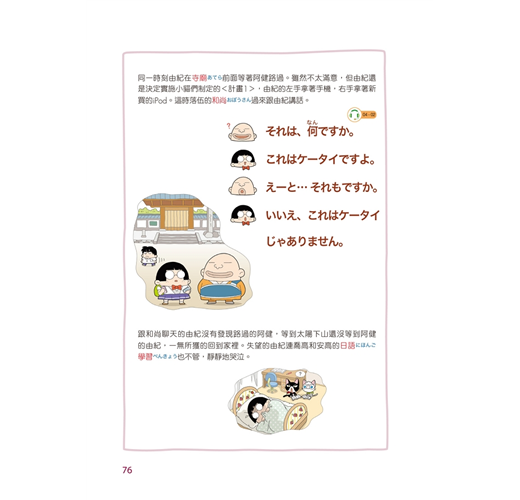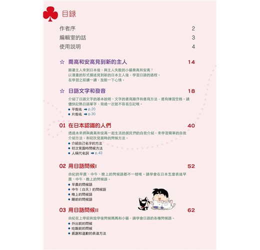 全書共有十六篇故事,透過故事主角有點搞怪的生活來學習日文,每一篇都有不同的學習目標,主題式的內容、循序漸進的方式,是最有效的學習方法!