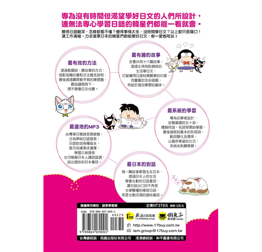 本書以十六篇有趣故事為基礎,搭配豐富全彩插圖,用日本人生活的每一天學會基礎日文,一次搞定五十音以及基本文法概念,生活常用的日語會話也沒有問題,連每天通告滿檔的韓星都一致肯定。
