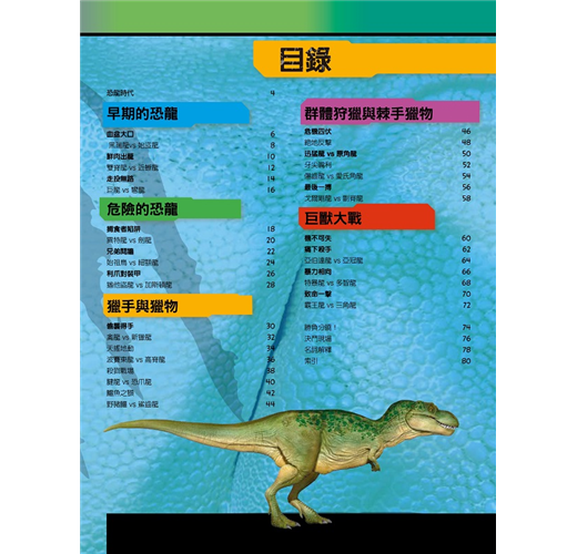 被挑選出來站上擂台的32種恐龍都是令人聞風喪膽的史前霸主。旁邊還有關於牠們(以及對手)的「資訊方塊」、「戰鬥能力」、「體型對照」和「秘密武器」,讓讀者得以充分認識即將開打的恐龍!