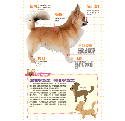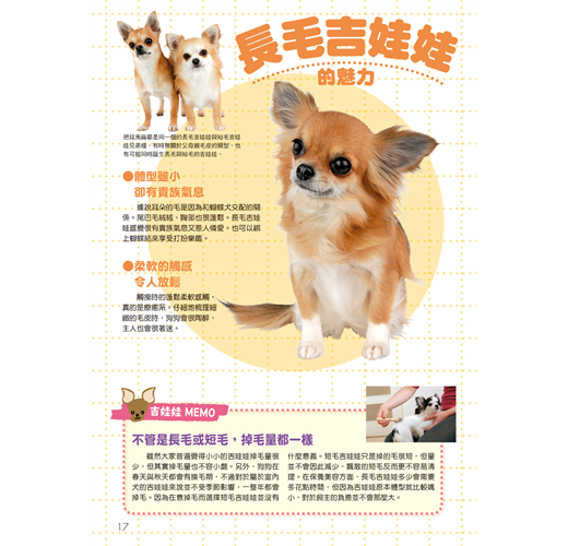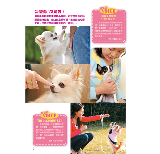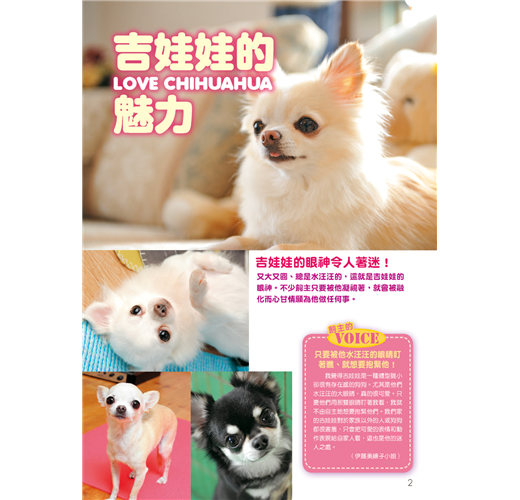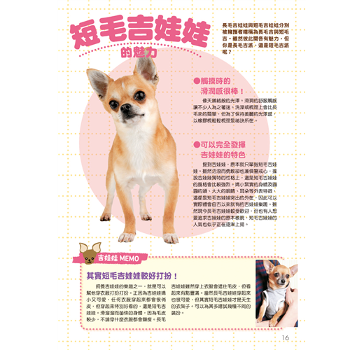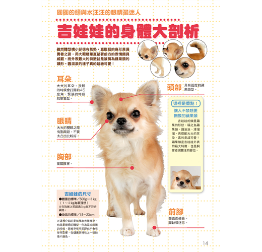 1.從吉娃娃的特徵開始介紹一直到與吉娃娃一同生活的大小事,循序漸進讓想飼養吉娃娃的人能事先做好功課。