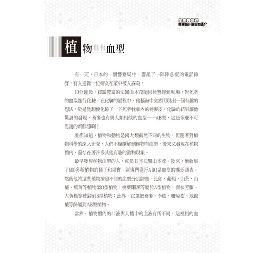 當然,植物體內的汁液與人體中的血液有所不同,這裡指的血型物質,實際上主要是汁液中精蛋白一類成分,與人體內的血型物質相似。今天,這種新奇的研究方法,成為一種新的植物分類方法──植物血清分類法的重要依據。