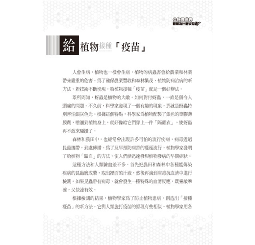 人會生病,植物也一樣會生病,植物的病蟲害會給農業和林業帶來嚴重的危害。為了確保農業豐收和森林繁茂,植物防病治病的新方法、新技術不斷湧現。給植物接種「疫苗」就是一個好辦法。