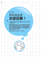 1.正視男女孩先天條件不公平:從荷爾蒙分泌週期、大腦結構……,檢視男孩從嬰兒時期、正在上學的男孩,以及青少年至成人的外在行為、心理上的階段性變化。