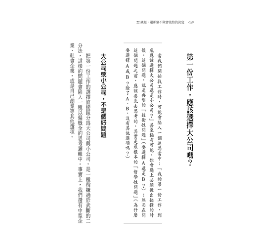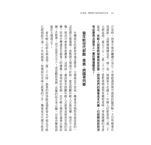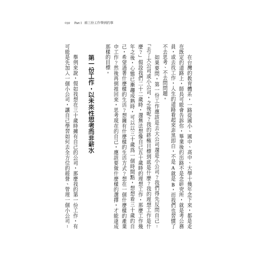 碰巧,在利用週末返回台北的一次旅程中,我和這一系列書籍當中的上一本著作《十八歲起,你的格局不一樣》的編輯團隊見了面。我們花了幾分鐘聊聊近況,談論我們合作了上一本書之後這兩年間,彼此在職業與個人生活上的發展,也談到對於彼此的再度合作有沒有什麼新點子。