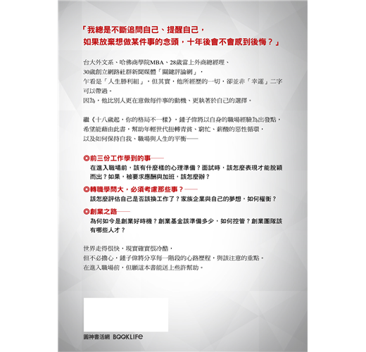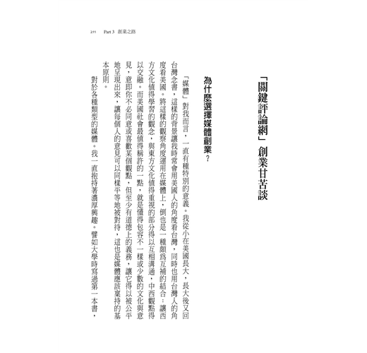 台大外文系、哈佛商學院MBA、28歲當上外商總經理、30歲創立網路社群新聞媒體「關鍵評論網」,乍看是「人生勝利組」,但其實,他所經歷的一切,卻並非「幸運」二字可以帶過。因為,他只是比別人更在意做每件事的動機、更執著於自己的選擇。