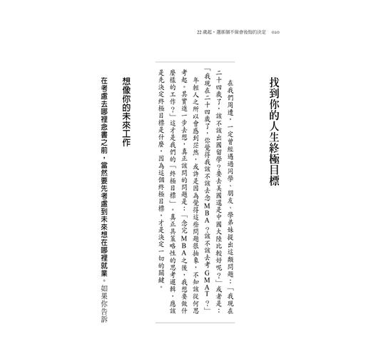 這一次,與其在每一章裡塞進一年的內容,不如把人生階段中最常面臨的選擇與決定,畫分成三個主要部分,探討我們在長大成熟的過程中如何思考與改變,以及如何規畫出最好的方法,讓自己獲致成功。