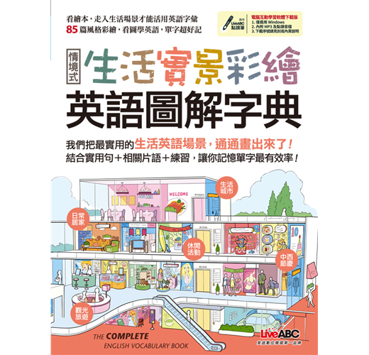 有時候你可能會覺得學英文學了那麼久,但是許多日常生活上常見的事物卻不知道英文怎麼說,在課堂上學到了句型、文法和對話,但很多生活英語單字就是沒辦法完全兼顧到,這本「生活實景彩繪英語圖解字典」就是要提供食衣住行育樂各層面中常見的生活英語單字,補充你在教室裡老師來不及教到的字彙,讓你的英語溝通能力更上一層樓。