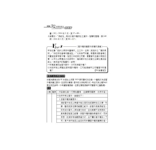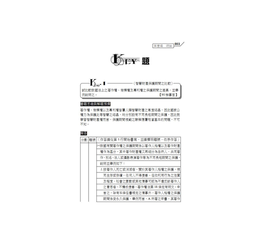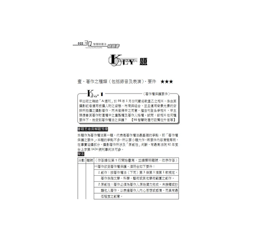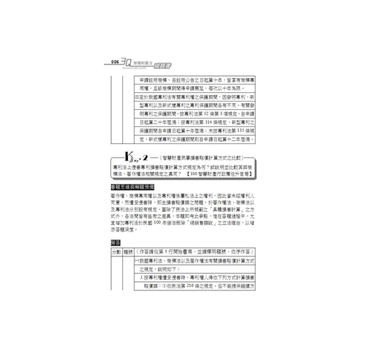 2.於著作、專利與商標各章節前,撰寫「解題技巧」,並於每題解題前,撰寫「審題思惟與解題預備」,提醒讀者本題所應注意的爭點與答題應注意事項。