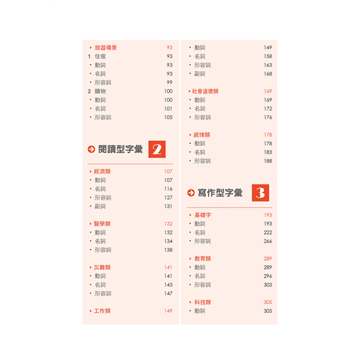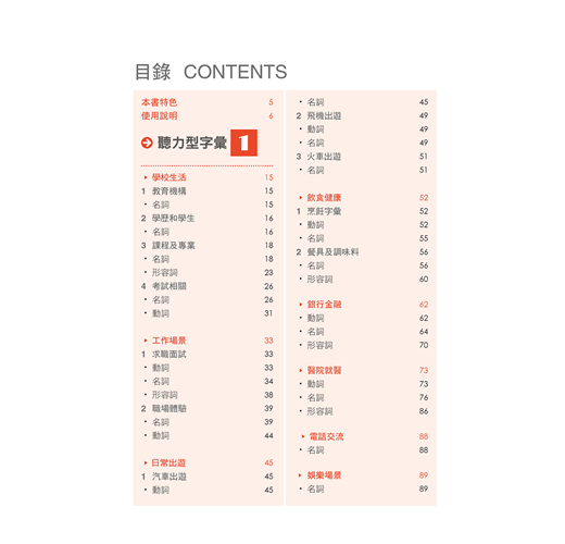 如果單字的排列方式是特別針對多益考試量身打造,按單字屬性分為4個章節:聽力型、閱讀型、寫作型和口說型字彙,又再依單字屬性細分為:經濟類、醫學類、工作類、教育類、科技類等,聽起來是不是有效率多了?如果你在做聽力測驗模擬試題時,銀行和醫院用語常聽錯,那你可直接翻到本書聽力型字彙下的「銀行金融」和「醫院就醫」,然後記下裡面的單字。這樣是不是有效率多了?