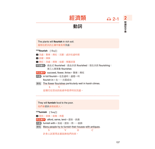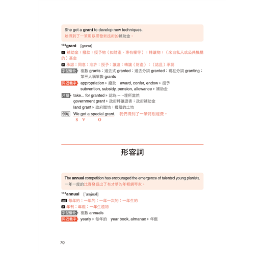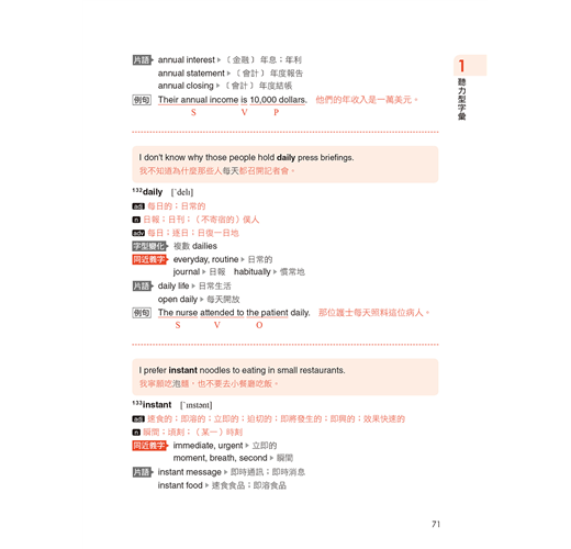在每個單字的第2個例句中以底線標出各部位的簡稱(S:主詞,V:動詞,O:受詞),讓讀者了解單字意思後,也能對句子結構一目瞭然。