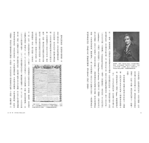 在同英國打的過程中還分兩派:一派要求和英國談判,只要英國答應條件,就還留在大英帝國內;另一派主張必須和英國一刀兩斷,建立一個新世界。建立新世界這個思想的代表人物,就是很有名的湯瑪斯.潘恩(Thomas Paine, 1737-1809〉,他寫的那個小冊子,我們譯為《常識》(Common Sense〉,等於是最早的獨立宣言。該書批評英國的制度已經是一個陳腐的制度,提出要建立一個嶄新的世界,脫離母體。其中有一句很有意思的話:「現在是從諾亞方舟以來(也就是開天闢地以來〉,千載難逢的一個機會,我們可以脫離舊世界,建設一個新世界。」了解這句話之後,就會理解,美國一天到晚認為它自己的制度是天下最好的、最優越的、最先進的,要把它的制度推廣到全世界,其根源就在潘恩的那本小冊子裡。當美國自己連國家都還沒有時,就已經想要把整個世界都改造過來。它當時心目中的舊世界就是歐洲。那時亞洲、非洲還都是殖民地,不在它的視野之內。當時最新的一派人就是有這樣的一種思想,而這些人都是從英國去的,原來也是英國人。當時的英國態度又非常強硬,拒絕他們的要求,並派兵鎮壓。於是要求獨立的思想逐漸占上風,他們最後在華盛頓的領導下,打敗了英國。他們就真的獨立了,脫離了英國。