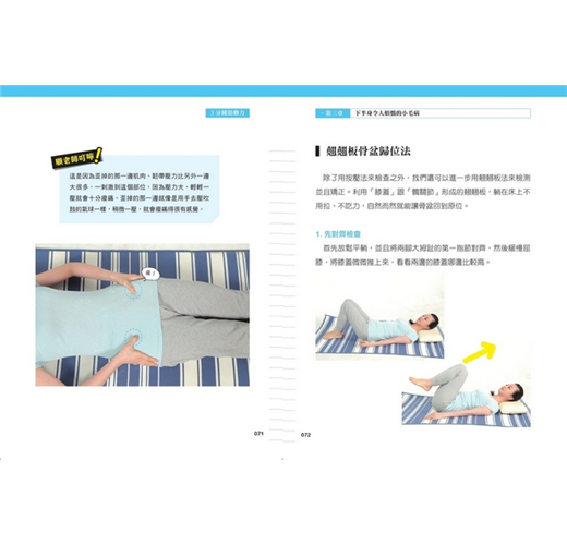 書中提到從日常生活中調整身體的概念,對現代人來說格外重要。應該要從日常生活的姿勢、工作的習慣、營養的攝取與運動的習慣,結合這幾個方面一起著手,不能光靠治療--等到身體出問題才去找醫師或推拿師調養,其實已經遲了。