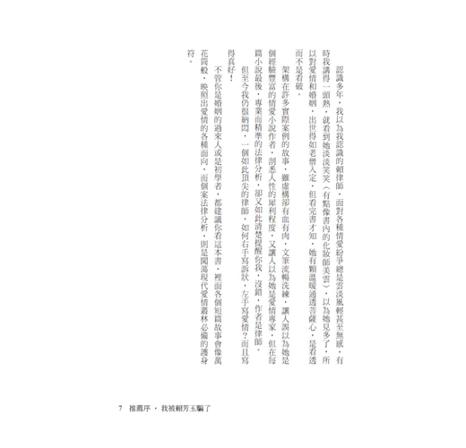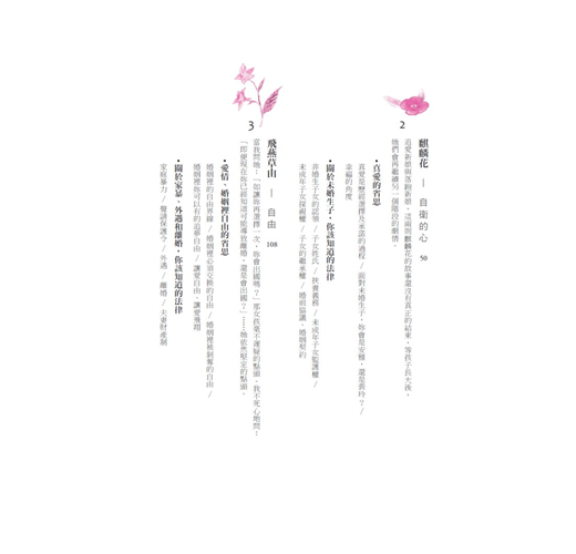 「裡面各個短篇故事會像萬花筒般映照出愛情的各種面向,而個案法律分析則是闖盪現代愛情叢林必備的護身符。」──林青蓉