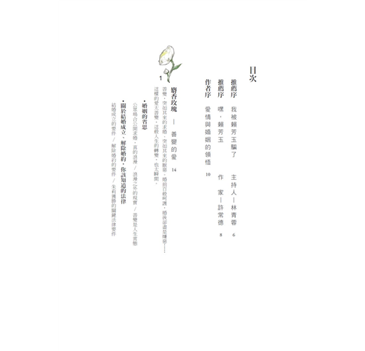 全台最頂尖的家事律師,賴芳玉將自己二十幾年來的辦案體悟與感動,以架空卻真實的故事,用虛擬人物說出每個人的曾經,傳遞著愛情婚姻裡的善變、防衛、自由、悲傷和嫉妒的省思,以及你該知道關於結婚成立、解除婚約的要件;非婚生子女的姓氏、扶養義務、監護權、探視權、繼承權;家暴、外遇、離婚、夫妻財產制;婆媳不和、父母子女扶養義務、撤銷贈與、遺棄罪、老人的權益等法律知識。