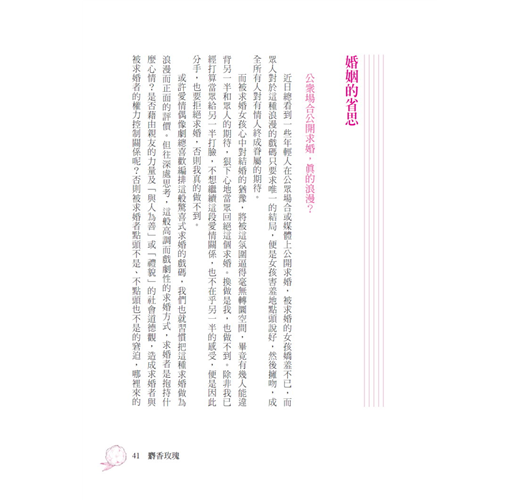 □公眾場合公開求婚,真的浪漫?這般高調而戲劇性的求婚方式,求婚者是抱持什麼心情?是否藉由親友的力量及「與人為善」或「禮貌」的社會道德觀,造成求婚者與被求婚者的權力控制關係呢?否則被求婚者點頭不是、不點頭也不是的窘迫,哪裡來的呢?或許有人會說,那就是浪漫的驚喜而已,有那麼嚴重嗎?倘若如此,那就當做是一場惡作劇或遊戲吧,配合男主角和眾人的演出,當個低頭垂頸的美人點個頭,或學學戲鳳的臺詞,把「哥哥不在家,今天不賣酒」改個詞「爸媽不在場,今天不點頭」,反正就是交往期間的調情,倒也不賴。別說這種心態和說法不尊重婚姻,因為求婚者給的尊重也就這麼多。